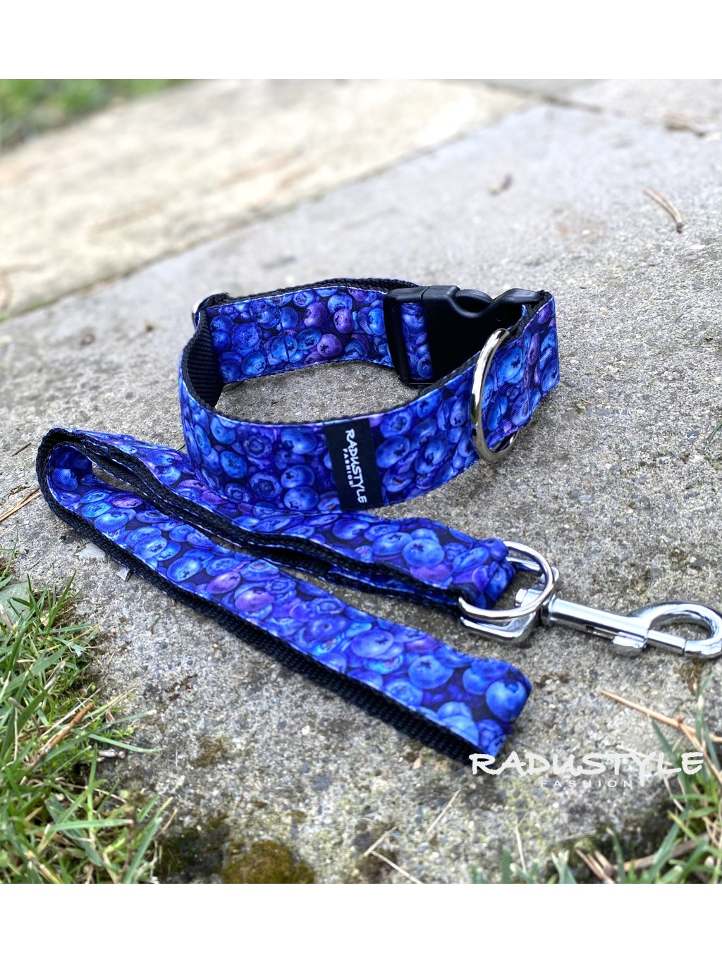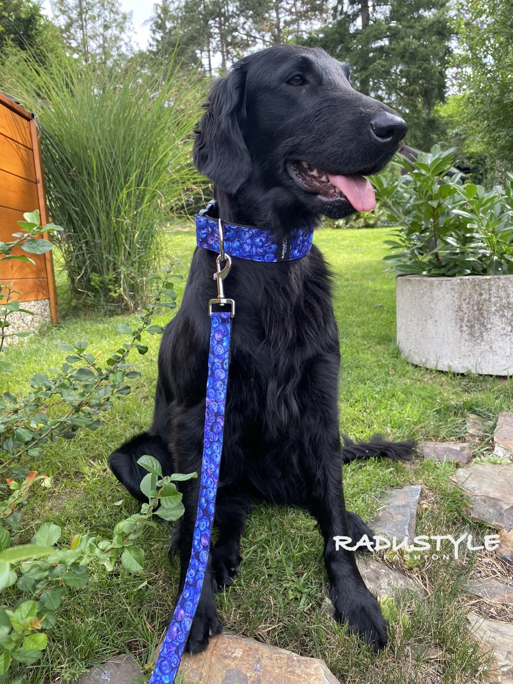 Sada obojku a vodítka pro větší a velká plemena s designem borůvek.